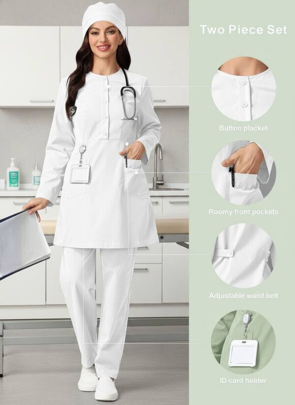• طراحی کاربردی با سه دکمه در قسمت بالای اسکراب و شلوار کمر کش